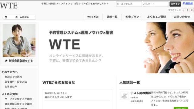 お知らせ・リリース オンライン英会話システムを元にしたシステムパッケージ「WTE(ワールドトークエンジン)」提供開始 2012年4月18日 WTE運営事務局 オンライン英会話システムを元にしたシステムパッケージ「WTE(ワールドトークエンジン)」提供開始 http://www.wte.jp …