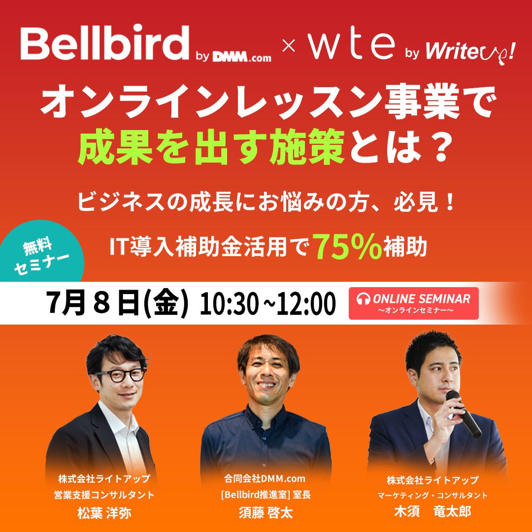 株式会社ライトアップ(本社:東京都渋谷区、代表取締役社長:白石崇、以下ライトアップ)は、合同会社DMM.com(本社:東京都港区、会長 兼 最高経営責任者(CEO):亀山敬司、以下DMM)が運営するオンラインコミュニケーションに関するOEMサービス「Bellbird by DMM」と共に、レッスン事業者向けにオンラインセミナーを開催いたします。